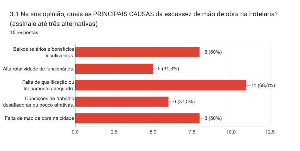 O estudo leva a seguinte reflexão: as análises apontam que a falta de qualificação profissional é o principal fator associado à escassez de trabalhadores, reforçada por salários pouco competitivos, condições de trabalho desafiadoras e alta rotatividade. Esses elementos, combinados, dificultam a atração e a retenção de profissionais, comprometendo tanto a eficiência operacional quanto a qualidade dos serviços prestados aos hóspedes.
