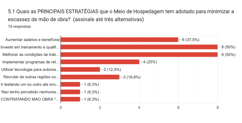 Por outro lado, uma parcela reduzida de participantes (6,3%) sinalizou a opção “outro motivo”, e, suas respostas foram: “ir testando um ou outro até encontrar um bom”, “não tenho percebido nenhuma mudança para ajustar isso”, e “contratando mão de obra extra” identificado a necessidade de mudanças ou ainda estar em fase de testar alternativas, o que reforça que a maioria dos meios de hospedagem reconhece a gravidade da escassez de mão de obra.
