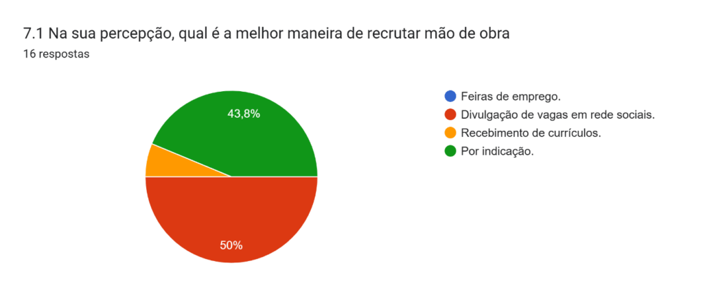 Por fim, é importante ressaltar que o recrutamento por meio de redes sociais e as indicações internas têm sido a principal estratégia empregada pelo setor, isso fica evidenciado como uma tendência de valorização das relações pessoais e das ferramentas digitais no ambiente profissional.