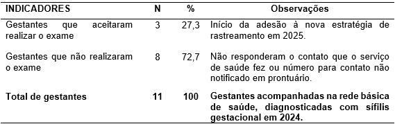 Essa iniciativa representa um avanço significativo na vigilância das infecções sexualmente transmissíveis (ISTs) no município, ampliando a capacidade diagnóstica e fortalecendo a prevenção de complicações obstétricas e neonatais. Em outubro de 2025, foi realizado contato com 11 gestantes (diagnosticadas com sífilis em 2024) em acompanhamento na rede de atenção básica, das quais três aceitaram realizar o exame de rastreamento, demonstrando o início da adesão a essa nova estratégia. Embora o número de participantes ainda seja reduzido, esse movimento evidencia a importância da educação em saúde e da sensibilização das gestantes para a adesão a novos exames que visam à detecção precoce de ISTs, muitas vezes assintomáticas, mas com alto potencial de comprometimento materno-fetal.