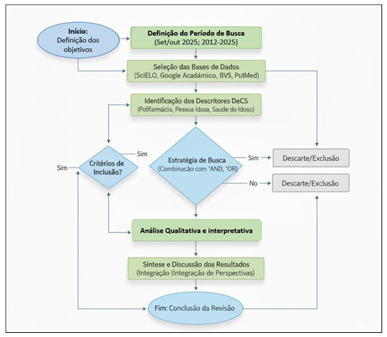 O presente estudo caracteriza-se como uma revisão bibliográfica de natureza descritiva e reflexiva. Este estudo foi conduzido entre os meses de setembro e outubro de 2025, utilizando as seguintes bases de dados eletrônicas: Scientific Electronic Library Online (SciELO), Google Acadêmico, Biblioteca Virtual em Saúde (BVS) e PubMed. Para a busca dos estudos, foram utilizados os Descritores em Ciências da Saúde (DeCS): Polifarmácia (Polypharmacy), Pessoa Idosa (Aged) e Saúde do Idoso (Health of the Elderly). As combinações entre esses descritores foram realizadas por meio dos operadores booleanos “AND” e “OR”, de modo a ampliar a abrangência e a precisão dos resultados encontrados, ilustrado em Figura 1.