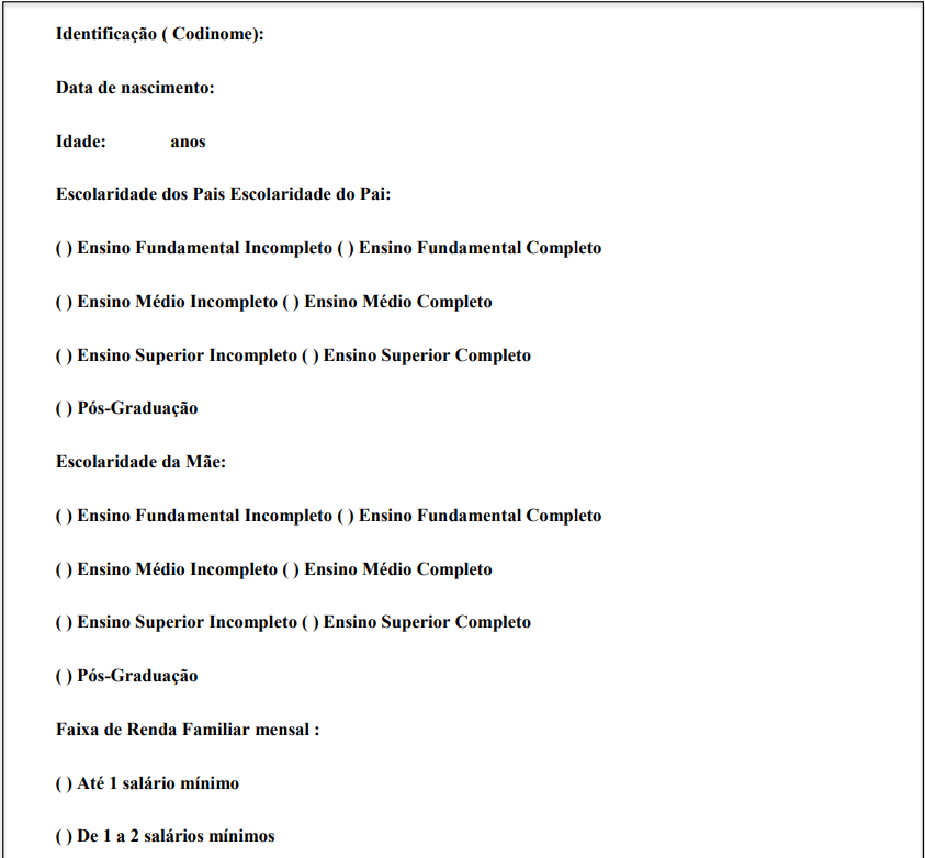 A coleta de dados do presente estudo foi iniciada após aprovação do CEP. Na sequência foi preenchida uma ficha sócio-demográfica (APÊNDICE I), para coletar os dados: identificação, sexo, idade e localidade onde reside, história da doença pregressa (HPP), história da doença atual (HDA) na anamnese. Posteriormente, foi aplicado o questionário Rosa Neto (1996), elaborado para avaliar o desenvolvimento da criança e adolescente (ANEXO I), possibilita analisar os principais marcos do desenvolvimento motor: motricidade fina, motricidade global, equilíbrio, esquema corporal, organização espacial, organização temporal de acordo com a faixa etária.