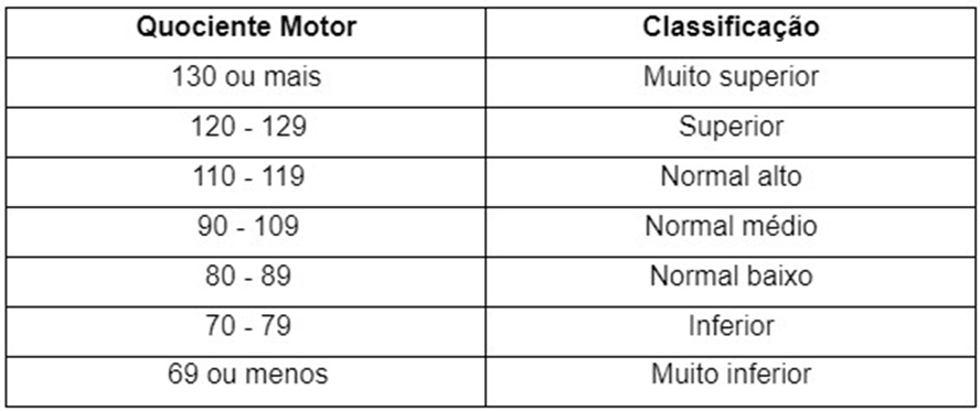 Com isso, a classificação dos resultados do Quociente Motor segue a metodologia utilizada no quadro abaixo, categorizado em níveis conforme o valor do Quociente Motor Geral.