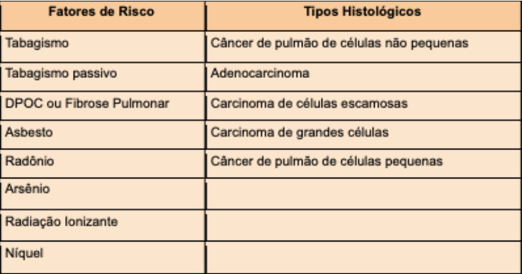 Tabela 1 Fatores de risco e tipos histológicos do câncer de pulmão