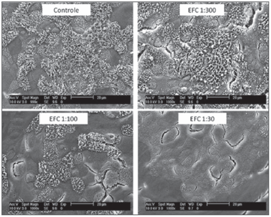 Figura 1 Fotografia de microscopia eletrônica de varredura demonstrando efeito dose-dependente da fumaça de cigarro sobre a porcentagem da área ciliada após exposição a diluições decrescentes de extrato de fumaça de cigarro.