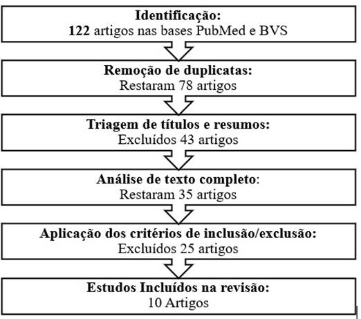A busca sistemática nas bases de dados PubMed e BVS, utilizando os descritores “cirurgia ortopédica”, “robótica” e “resultados clínicos”, resultou em 122 artigos. Após a remoção de duplicatas e a aplicação dos critérios de inclusão e exclusão, 10 estudos foram selecionados para a revisão sistemática. O processo de seleção dos artigos está ilustrado no Fluxograma (Figura 1).
