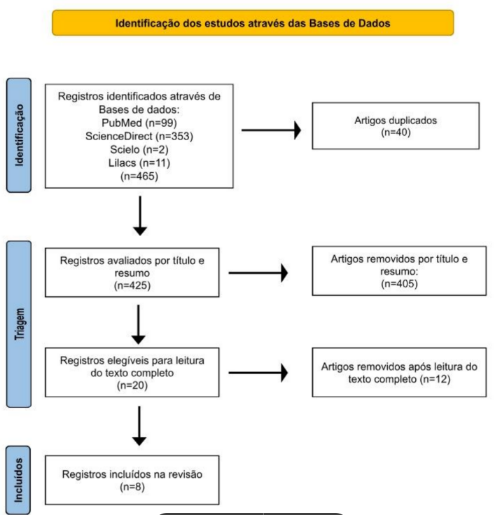 No conjunto, foram identificados 465 estudos nas etapas iniciais de busca. Após a remoção de duplicados (40 registros excluídos), 425 estudos foram encaminhados à etapa de triagem por título e resumo. Destes, 20 artigos foram considerados elegíveis e seguiram para leitura na íntegra. Dessa forma, com base nos critérios previamente estabelecidos, 8 estudos foram incluídos na revisão, conforme demonstrado no fluxograma PRISMA (Figura 1).