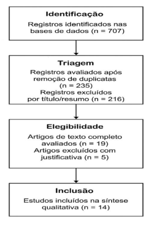 A busca inicial resultou em 707 registros. Após a remoção de duplicatas e triagem, restaram 235 estudos. Destes, 19 foram lidos na íntegra, sendo 5 excluídos por não atenderem aos critérios. A amostra final foi composta por 14 artigos. O processo de seleção está detalhado na Figura 1.
