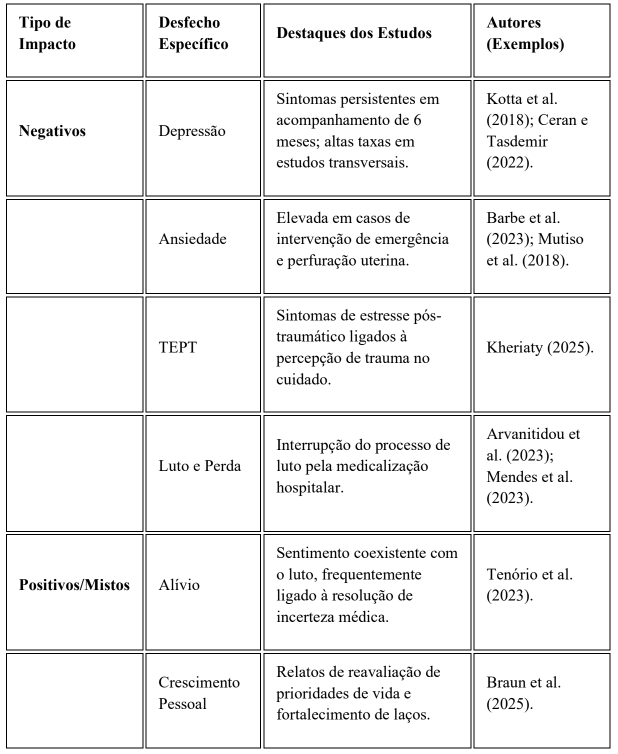 - Desfechos Paradoxais: Em contraste com os desfechos negativos, uma subanálise dos dados revelou a existência de respostas emocionais mistas. Estudos como os de Tenório et al. (2023) e Braun et al. (2025) descrevem sentimento de alívio coexistindo com o luto, além de relatos de crescimento pós-traumático e reordenação de prioridades de vida, sugerindo que a resposta ao aborto não é monolítica, mas sim mediada por contextos individuais e clínicos.