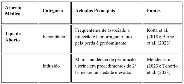 - Etiologia do Aborto: Observou-se uma distinção qualitativa no sofrimento baseada na tipologia do aborto. Nos casos espontâneos, predominou o luto pela perda do projeto parental, frequentemente agravado por complicações infecciosas. Já nos casos induzidos, especialmente aqueles de segundo trimestre ou decorrentes de razões médicas, a ansiedade e o medo de julgamento moral pela equipe de saúde foram os estressores dominantes (MENDES et al., 2023; TENÓRIO et al., 2023).
