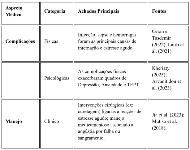 A análise dos estudos indicou que a gravidade do quadro clínico atua como um potente catalisador do sofrimento emocional. Não se trata apenas da perda da gestação, mas da experiência somática do processo intra-hospitalar.