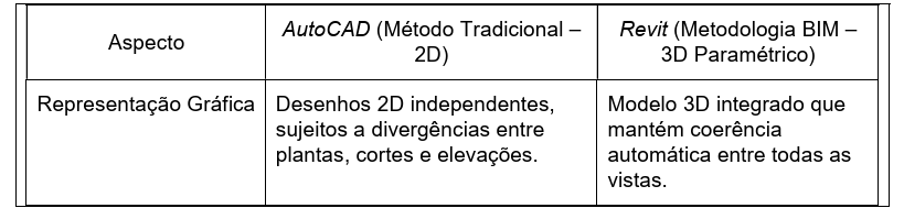 Com base nas ferramentas utilizadas, definem-se os seguintes critérios para a análise comparativa entre a abordagem tradicional (AutoCAD) e a metodologia BIM:
