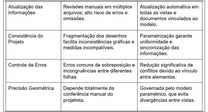 | Fluxo de trabalho | Alterações feitas manualmente em cada vista do projeto, demandando mais tempo e esforço. | Modificações atualizam automaticamente todas as vistas do modelo, tornando o processo mais ágil. |