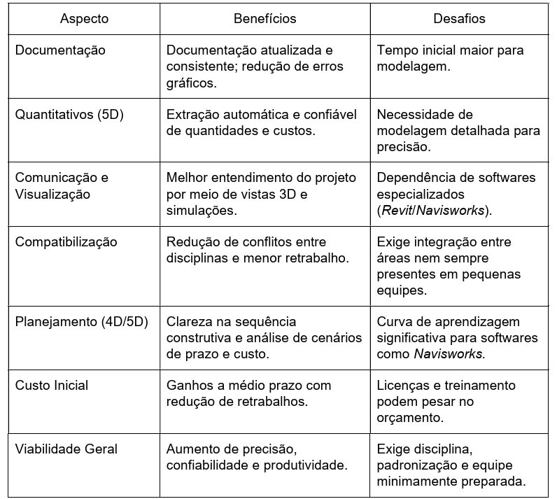 A implantação do BIM 4D e 5D em projetos de pequeno porte demonstrou benefícios concretos (quadro 3), sobretudo na produção de documentação atualizada, no controle de quantitativos, na redução de conflitos entre disciplinas e na melhoria da comunicação por meio de visualizações 3D e 4D. Esses ganhos tendem a ser particularmente relevantes em obras pequenas, onde retrabalhos e inconsistências têm impacto proporcionalmente elevado sobre o custo total.