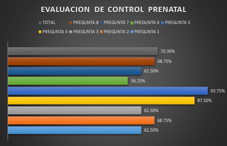 Los valores presentados reflejan el porcentaje de participantes que respondieron en la encuesta de controles prenatales que contiene preguntas acerca de cuántas veces asistía a sus controles prenatales, realizada para esta investigación, en cada fase de la prueba. Con el objetivo de educar a las mujeres embarazadas sobre los beneficios de los controles prenatales regulares para garantizar un embarazo saludable tanto para la madre como para el bebé. Para determinadas preguntas, el número de respuestas acertadas en la evaluación final fue igual o mayor que en evaluación inicial, lo que apoya la conclusión de que las sesiones educativas fueron efectivas.