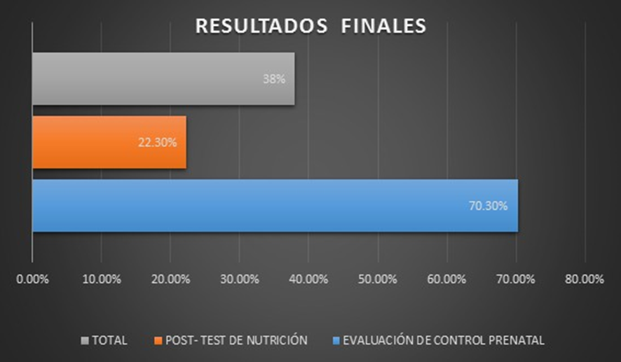 Como resultados finales se evidenció que entre Ia evaluación y los test aplicados a las participantes donde se vio que las charlas impartidas tanto por el equipo de estudiantes de medicina y por los doctores expertos influyó en el grado de conocimiento sobre los controles prenatales, lactancia materna y los beneficios e importancia de la nutrición en el embarazo en un 38%.