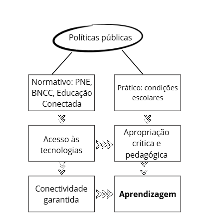 Essas tensões podem ser visualizadas no Mapa conceitual da Figura 1, que sintetiza os principais contrastes identificados entre o plano normativo e a realidade prática, entre o acesso às tecnologias e a sua apropriação pedagógica.