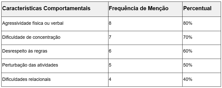 As professoras entrevistadas identificaram diversas características comportamentais associadas ao aluno indisciplinado. As mais frequentemente mencionadas foram: agressividade (mencionada por 8 participantes), dificuldade de concentração (7 participantes), desrespeito às regras (6 participantes) e perturbação das atividades (5 participantes), ver tabela 1: