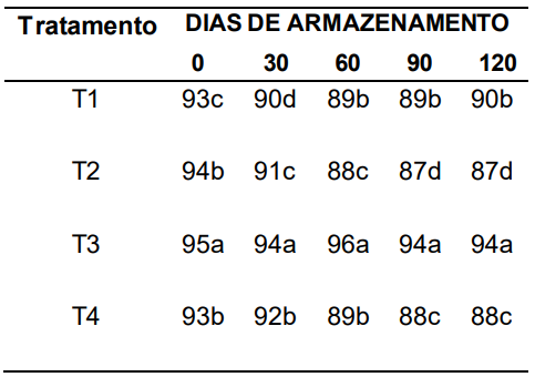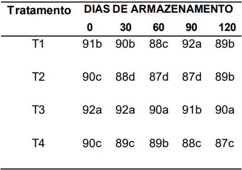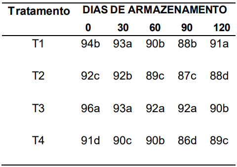Os resultados do teste de envelhecimento acelerado (%) (Tabela 3) mostraram que o pré-resfriamento seguido de armazenamento em câmara fria foi o tratamento mais eficiente, mantendo valores elevados e estáveis (94–96%) durante todo o período experimental. Em todos os tempos avaliados, esse tratamento apresentou superioridade estatística, indicando que a redução térmica antes da estocagem minimiza o impacto do envelhecimento fisiológico.