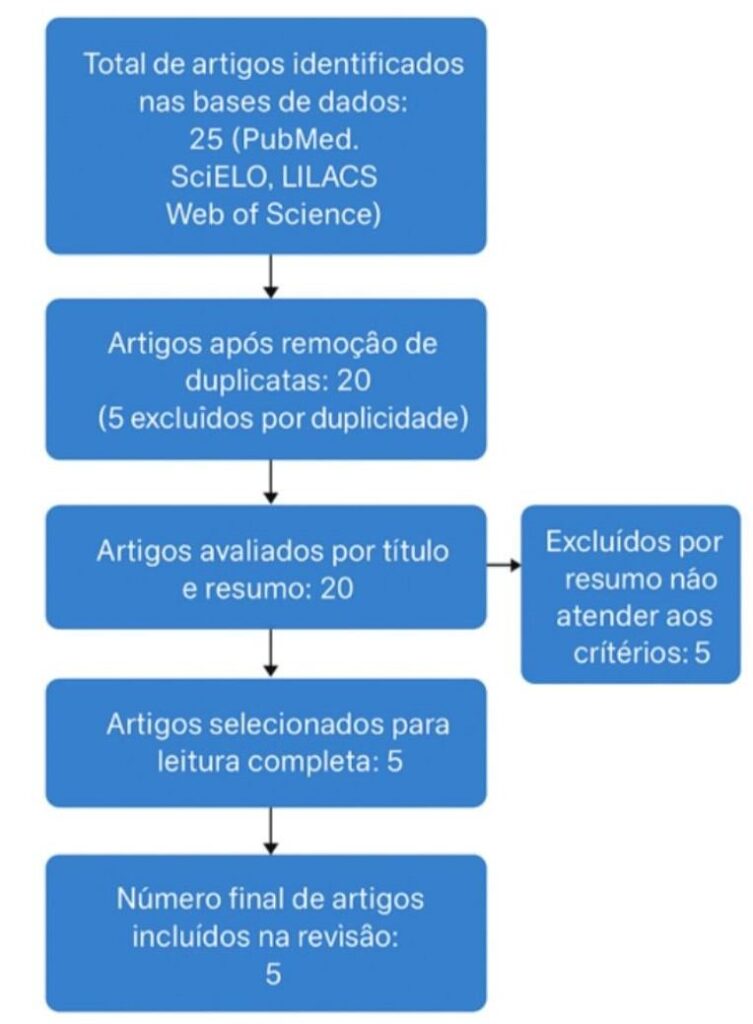 A busca bibliográfica foi realizada entre abril e julho de 2025, nas bases de dados PubMed, SciELO, LILACS e Web of Science, selecionadas por sua relevância em pesquisas biomédicas e multidisciplinares. Utilizaram-se descritores em português e inglês, combinados por operadores booleanos “AND” e “OR”: (“dor crônica” OR “chronic pain”) AND (“lesões ortopédicas” OR “orthopedic injuries”) AND (“transtornos depressivos” OR “depressive disorders”) AND (“reabilitação” OR “rehabilitation”) AND (“tratamento multidisciplinar” OR “multidisciplinary treatment”). Foram aplicados filtros de período (2010–2025), idioma (português e inglês), população (adultos ≥18 anos) e tipo de documento (artigos originais revisados por pares e disponíveis em texto completo). Os resultados foram exportados para o software Mendeley, utilizado para gerenciamento de referências e remoção de duplicatas.