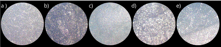 Figura 9 – Análise micrográfica com lente de 20X a) CP1 (80 A) b) CP2 (90 A) c) CP3(100 A) d) CP4 (110 A) e) CP5 (120 A)