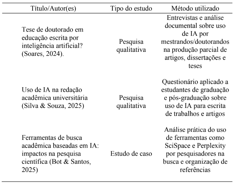Como critérios de inclusão, utilizou-se estudos originais empíricos realizados no Brasil ou com foco explícito no contexto brasileiro; abordando diretamente o uso de IA na produção de artigos científicos; apresentando dados coletados por meio de experimentos, entrevistas, estudos de caso ou análises documentais. Foram excluídas revisões de literatura, ensaios teóricos, editoriais, cartas e estudos cujo foco de IA não estivesse relacionado à elaboração de artigos científicos.