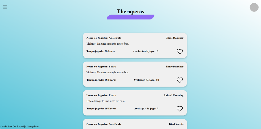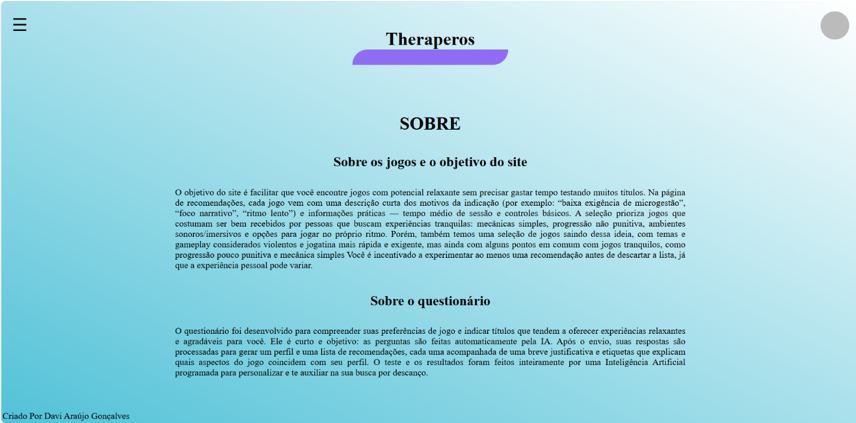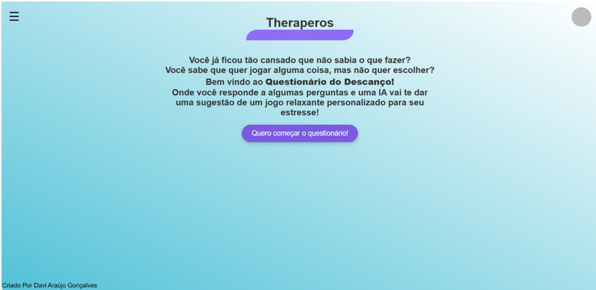 Resumo: O objetivo deste trabalho é desenvolver uma plataforma em html que se junta com jogos feitos por Unity, e com um banco de dados através de uma API em Java, com a implementação de um Token JWT para segurança. Tal site visa auxiliar usuários que carecem de conhecimento emocional para mitigar o estresse do cotidiano. O site Theraperos consta com um questionário desenvolvido por Inteligência artificial do Gemini, assim o consumidor responderá de maneira breve revelando seu perfil e qual jogo se enquadrar em sua personalidade, o frontend conversa com a Inteligência Artificial por uma API em Python, isso permite que as perguntas possam ser personalizadas dependendo de respostas anteriores e comentários feitos pelo usuário. Além disso, muitas pessoas possuem limitações como problemas financeiros e bloqueios pessoais, essa barreira pode ser contornada quando o indivíduo seleciona outros meios de expressar sua emoção, uma dessas opções é através da jogatina. Este projeto também consta em sua plataforma, jogos específicos para cada perfil de personalidade, oferecendo uma alternativa acessível e econômica ao tratamento tradicional terapêutico. Ao entrar no site, a pessoa se depara com os jogos na tela inicial, uma vez que o foco principal do site é o fácil acesso do usuário a jogatina. Porém, se o jogador almeja maior auxílio, há a opção de cadastramento, para que realizem o questionário com a inteligência artificial, direcionando o referido usuário para opções que condizem ao perfil do jogador no site.
