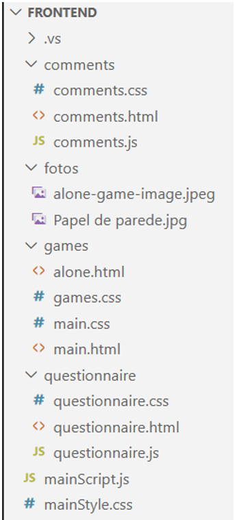Esta subseção apresenta as telas que compõem o sistema seguindo a ideia do protótipo (Figuras 1-4) e comentados na estrutura de pastas do projeto (Figura 10). Na tela inicial (Figura 11) são exibidos os jogos disponíveis junto de imagens do cenário principal do respectivo jogo, embaixo de cada imagem, uma aba com o nome do jogo pode ser vista, onde clicando nela, irá para a tela do jogo em si (Figura 12), clicando no ícone de menu, o usuário pode ir para as telas de comentários (Figura 13), questionário (Figura 14) e sobre (Figura 15).