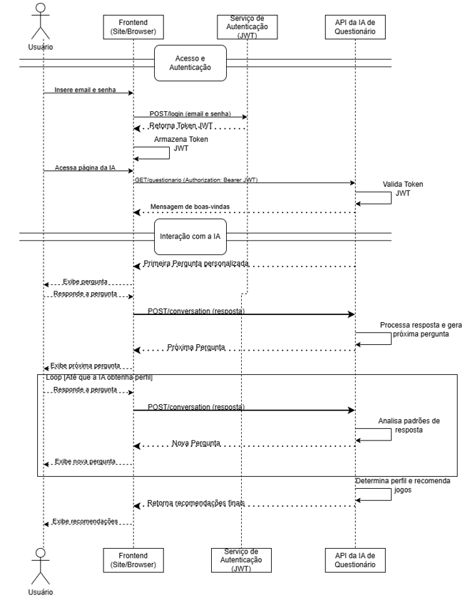 No Diagrama de Sequência (Figura 6) abaixo é apresentado o fluxo correspondente ao questionário previamente discutido. O diagrama mostra como o sistema responde ao processo do cliente respondendo ao questionário, e quais sistemas são utilizados para esse processo.