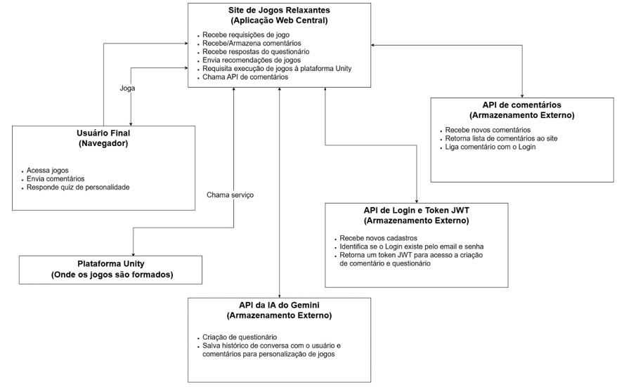 O desenvolvimento do site de jogos relaxantes foi dividido em quatro partes: frontend para a interface que o usuário vai interagir com o site e o backend foi dividido em três partes, a primeira focada na manipulação e armazenamento de dados, a segunda parte para os jogos que irão estar disponíveis no site, e na terceira parte, foi configurada uma IA para criação de um questionário personalizado. No backend foi implementada uma API com Java e Mysql em InteliJ para manter, de uma forma segura e consistente, os comentários feitos pelos usuários. A plataforma Unity também foi utilizada para criação do jogo, interligando ao frontend pelo GitHub. E foi utilizada uma API da inteligência artificial do Google, o Gemini, na linguagem Python, na plataforma Pycharm. Já no frontend, todas essas implementações se conversam pelo Javascript de sua respectiva aba, que também contém um código em CSS e HTML para a customização da página.
