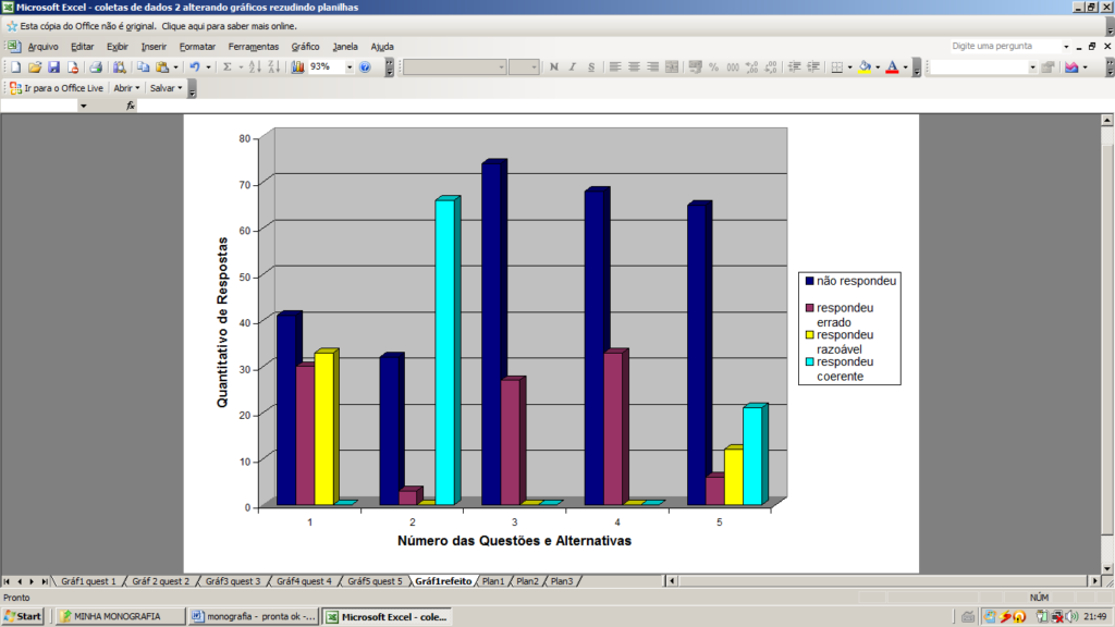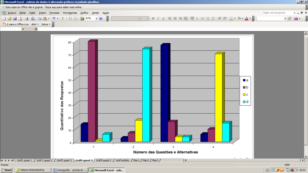 O gráfico 1 verificou o conhecimento prévio dos alunos quanto ao que os mesmos já sabiam sobre alguns conceitos básicos do funcionamento das lâmpadas incandescentes e fluorescentes. O questionário, como foi explicado, continha cinco (5) perguntas dissertativas. Para efeito de avaliação das respostas dos alunos, utilizou-se os seguintes critérios: não respondeu, respondeu errado, respondeu razoável e respondeu coerente, que foram identificadas, respectivamente, pelas letras “a”, “b”, “c” e “d”. A análise do gráfico acima revelou um dado surpreendente: os alunos demonstraram não saber o que é uma lâmpada. Contudo, sabem que serve para iluminar um ambiente. Quanto aos tipos de lâmpadas, comumente empregadas nas residências, quase todos sabem que as lâmpadas podem estar classificadas em incandescente e fluorescente. Todavia, desconhecem os processos que geram a luz, seja na incandescente ou fluorescente. Também, pode ser observado que os alunos desconheciam os componentes básicos de uma lâmpada fluorescente convencional. Para uma análise mais detalhada do gráfico 1  segue à tabela 4 de amostragem dos dados referentes ao questionário 2. As alternativas corretas são as que possuem maior tiragem.