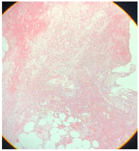Achados Microscópicos: os cortes histológicos do apêndice revelaram extensa infiltração difusa de tecido adiposo maduro nas camadas da parede apendicular, caracterizando lipomatose (Figura 4). Os adipócitos apresentavam morfologia completamente diferenciada, sem atipias ou figuras de mitose, e estavam envolvidos por finas traves de estroma fibroso, sem formação de cápsula circunscrita. Adicionalmente, observou-se na superfície serosa um denso infiltrado inflamatório agudo neutrofílico associado a depósito fibrinoso, configurando uma serosite fibrinoleucocitária (Figura 3 e Figura 5). Importante notar que não havia comprometimento inflamatório significativo da mucosa ou submucosa – achado compatível com periapendicite ou apendicite serosa. Não se identificaram áreas de atipia celular, necrose ou padrão lobular que sugerissem transformação maligna em lipossarcoma. Com base nesses achados, concluiu-se o diagnóstico de lipomatose do apêndice cecal associada à serosite fibrinoleucocitária. Foram produzidas lâminas representativas das lesões observadas (Figura 6).