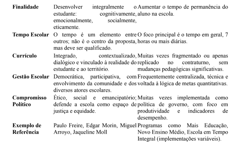 O quadro 1 foi, então, sistematizado com base em critérios comparativos entre essas duas visões, articulando as categorias extraídas da literatura com a análise das políticas públicas aplicadas no contexto da Bahia. A articulação foi feita de forma dialógica, inserindo as contribuições teóricas no corpo do debate prático-educacional, com o intuito de evidenciar as limitações conceituais das políticas baseadas apenas na ampliação do tempo escolar e as possibilidades formativas quando se compreende o tempo como dimensão existencial, histórica e cultural.