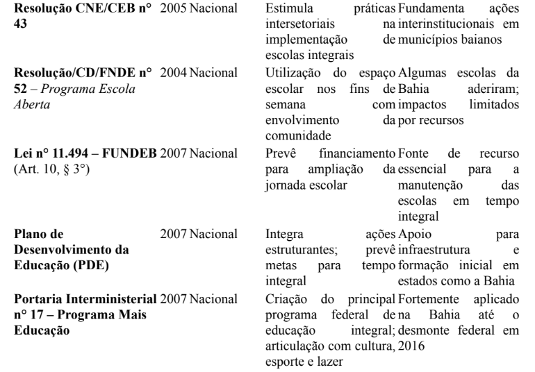 Durante a análise, nos atentamos para as promessas e limitações que permeiam os marcos legais da educação integral. Reconhecemos que, embora a legislação aponte para uma concepção ampliada e emancipadora de educação, sua concretização nas escolas públicas da Bahia enfrenta obstáculos materiais e simbólicos. Dentre eles, destacamos a desigualdade no financiamento, a precarização da formação docente, e a dificuldade de adaptação das diretrizes nacionais às realidades regionais. Esses elementos foram tratados como expressões de desigualdades estruturais e não como desvios isolados do sistema.