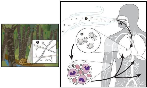 Legenda: 1- forma saprofítica do B. dermatitidis em solo úmido rico em matéria orgânica, apresentando hifas com conídeos. 2- Inalação de conídeos infectantes. 3- Entrada e instalação nos tecidos pulmonares. 4- Transformação em levedura. 5- Chegada de macrófagos residentes, que internalizam o fungo e produção de citocinas no combate ao patógeno.