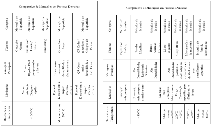 - COSTA, A. M.; ALMEIDA, R. P.; SOUZA, L. B. Métodos de marcação em próteses removíveis: revisão sistemática. Revista de Odontologia Forense, v. 15, n. 2, p. 45-56, 2021.Demarosi, F.; Malavasi, C.; Levrini, L. (2025). 3D printing and prosthetic traceability. Clinical Oral Investigations.