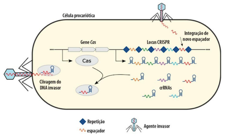 O sistema CRISPR foi inicialmente identificado em organismos procariontes, caracterizando-se como um mecanismo imunológico adaptativo mediado por componentes de RNA e proteína. Esse sistema é utilizado por bactérias e arqueas para proteção contra infecções virais e plasmidiais, conforme ilustrado na Figura 1. Ao ocorrer a incursão por agentes invasores, possui habilidade para integrar um segmento do genoma invasor constituindo um novo espaçador (em vermelho) no próprio locus CRISPR. Quando houver uma invasão posterior pelo mesmo agente externo, os crRNAs sintetizados derivados de seu próprio locus associam-se às proteínas Cas, possibilitando a detecção das estruturas do DNA externo assim rompendo as moléculas do mesmo (LOPES FILHO et al., 2020).