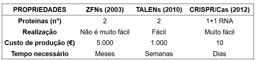 Tabela 1 – Comparação entre as metodologias de primeira geração e a tecnologia de edição genética CRISPR/Cas.