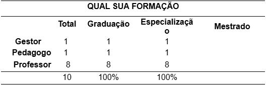 A tabela 02 apresenta a formação profissional na qual é possível perceber que 100% dos participantes possuem graduação com especialização na área da educação. Buscando aprimorar cada dia mais seus conhecimentos para serem repassados a seus alunos. Pois sabemos que a educação vive em mudanças constantes, o que faz do profissional que nela atua um eterno estudante, na medida em que sempre tem que se atualizar para cumprir com a responsabilidade de preparar pessoas conscientes do que é exercer uma profissão pautada no exercício pleno da cidadania. Segundo Formosinho (1991), a formação continuada é fundamental para a formação de indivíduos.