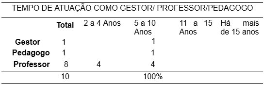 Verificou-se na tabela 03 que o tempo de atuação dos profissionais é de até 10 anos. Isso mostra que os educadores têm bastante experiência na área de educação. Dessa maneira ao observarmos a experiência que possuem demonstra conhecimento intelectual e prática.