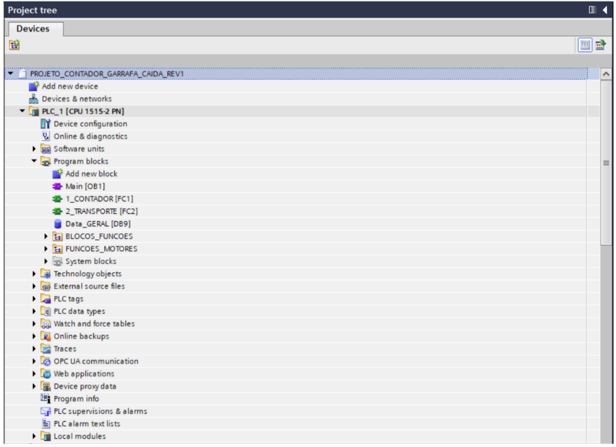 A Figura 1 apresenta a estrutura geral do projeto desenvolvido no TIA Portal V17, com a CPU Siemens S7-1500 utilizada, a organização dos blocos de programa, tabelas de variáveis e bancos de dados.