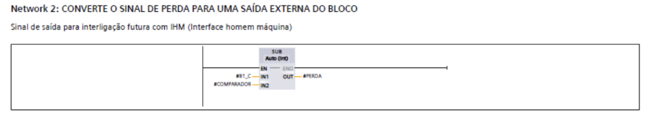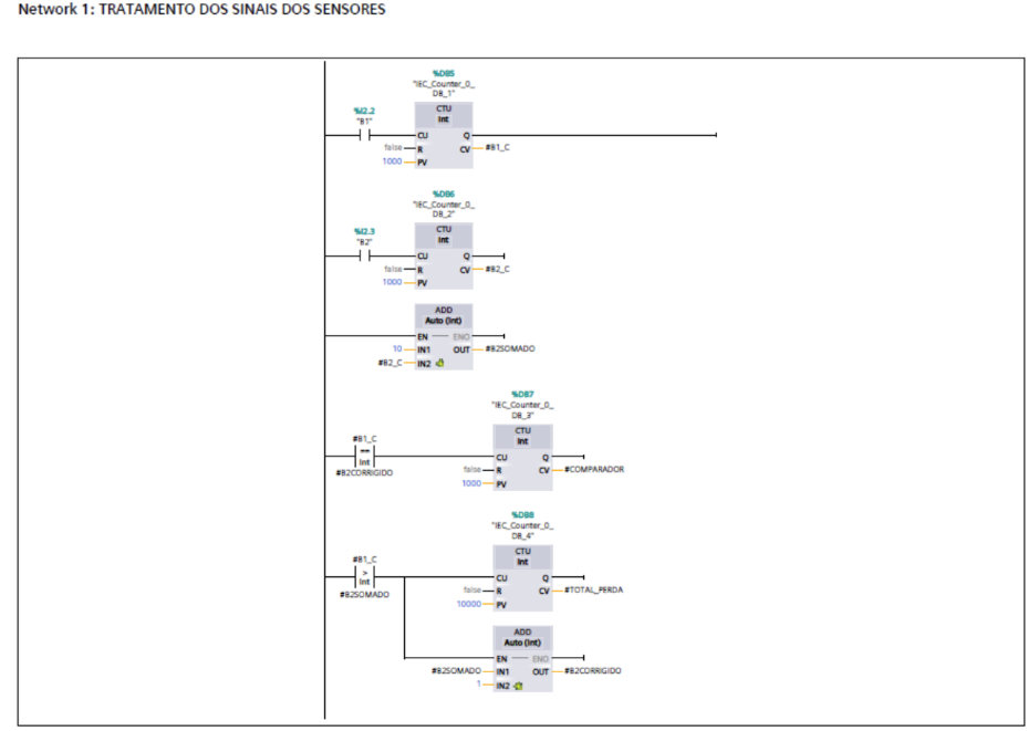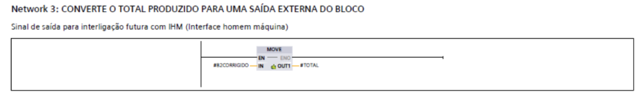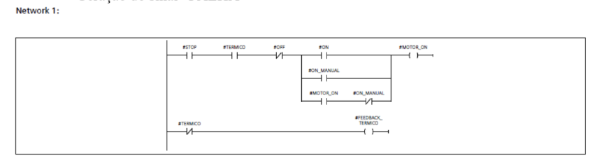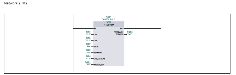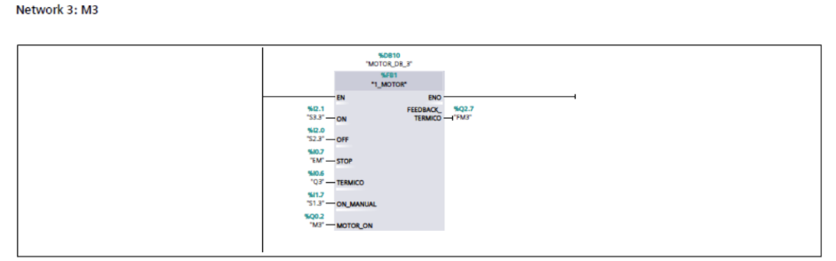 Já a função FC2, que controla os três motores, apresentou uma lógica clara e fácil de escalar. Ela utilizou intertravamentos, selo, permissivos e detecção de falhas. A criação do bloco FB1 como padrão para os motores ajudou a padronizar a lógica entre todas as unidades acionadas, facilitando a manutenção, a leitura do código e possíveis expansões do sistema.