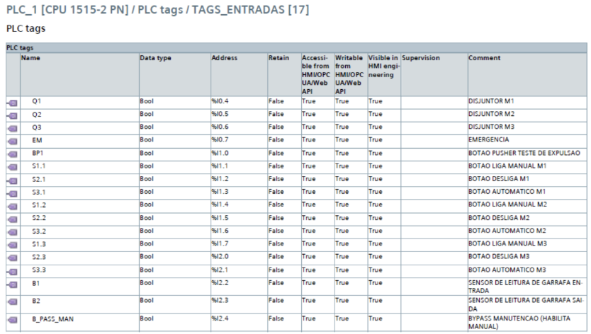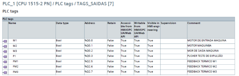 As tabelas de I/O do CLP foram configuradas no TIA Portal e contêm: