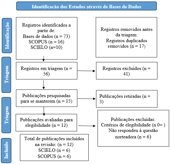 A partir dessa estratégia, foram identificados 73 estudos. Iniciou-se, então, a primeira peneira, com a leitura dos títulos e resumos, a fim de verificar o cumprimento dos critérios de inclusão, além da exclusão de duplicatas e publicações fora do escopo. Em seguida, os dados foram sistematizados em tabelas e lidos integralmente na segunda peneira, resultando em um total de 12 estudos selecionados conforme os critérios, conforme fluxograma PRISMA (Figura 1)