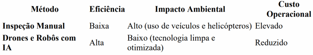 Os métodos tradicionais de inspeção exigem deslocamento de equipes técnicas, o que pode ser inviável em áreas remotas como a Amazônia. Já a abordagem baseada em drones e robôs independentes permite a inspeção aérea e terrestre em tempo real, com maior abrangência e precisão. A combinação dessas tecnologias com IA não apenas melhora a eficiência, mas também reduz custos e aumenta a segurança do setor.