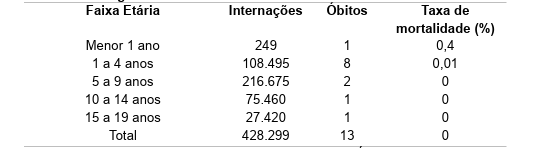 Já na faixa pediátrica – considerando-se indivíduos de 0 a 19 anos, foco deste estudo, ao todo foram registradas 428.299 internações nesse grupo etário, com 13 óbitos, resultando em uma taxa de mortalidade praticamente