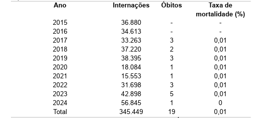 Tabela 1. Número de interações, óbitos e taxa de mortalidade por doenças crônicas das amígdalas no Brasil, nos últimos 10 anos (2015 a 2024).