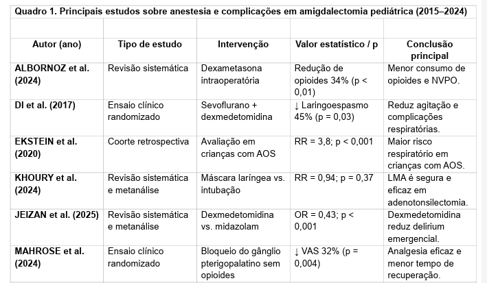 A análise dos últimos dez anos evidencia avanços expressivos nas práticas anestésicas aplicadas à amigdalectomia pediátrica, tanto na segurança intraoperatória quanto na redução de complicações pós-operatórias. A literatura recente reforça que o manejo anestésico adequado é determinante para os desfechos clínicos favoráveis, contribuindo para a queda da morbimortalidade associada a esse procedimento (ALBORNOZ et al., 2024; SHAWAHNA et al., 2025).