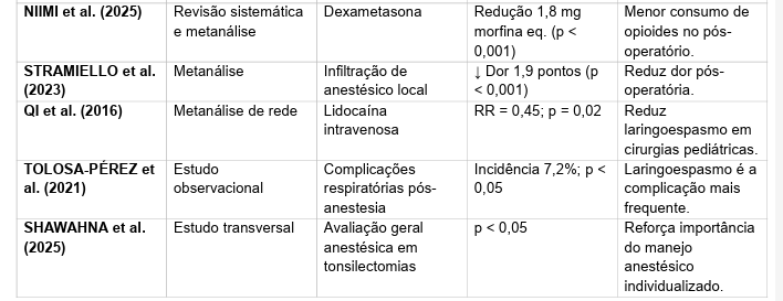 Stramiello et al. (2023) demonstraram que a infiltração local de anestésico reduziu os escores de dor em 1,9 pontos na escala visual (p < 0,001). Já Qi et al. (2016), em metanálise, relataram que o uso profilático de lidocaína intravenosa reduziu a incidência de laringoespasmo em 55% (RR = 0,45; p = 0,02) em cirurgias pediátricas.
