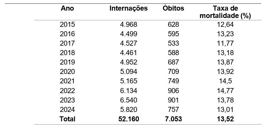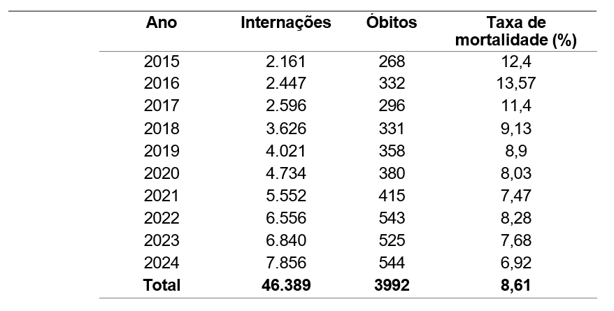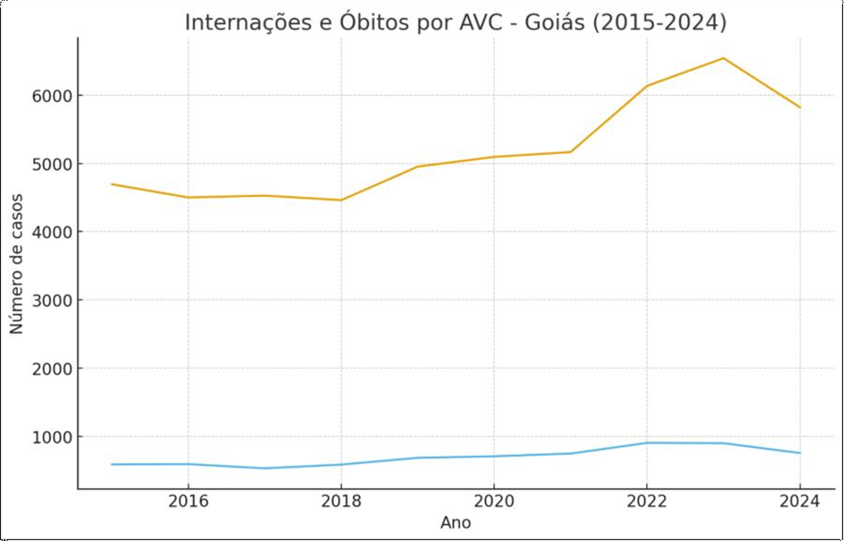 A tabela abaixo (tabela 1) apresenta os dados de morbidade hospitalar por Acidente Vascular Cerebral (AVC), incluindo formas isquêmicas transitórias, síndromes correlatas e casos não especificados, registrados no Sistema Único de Saúde (SUS) no estado de Goiás, no período compreendido entre 2015 e 2024. Foram consideradas as variáveis: número de internações, número de óbitos e taxa de mortalidade hospitalar anual.